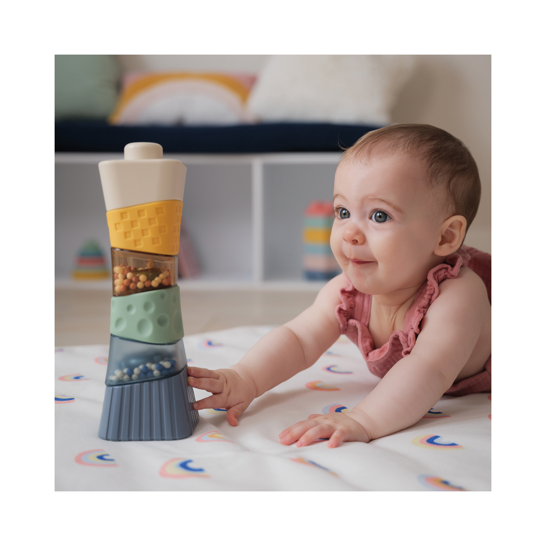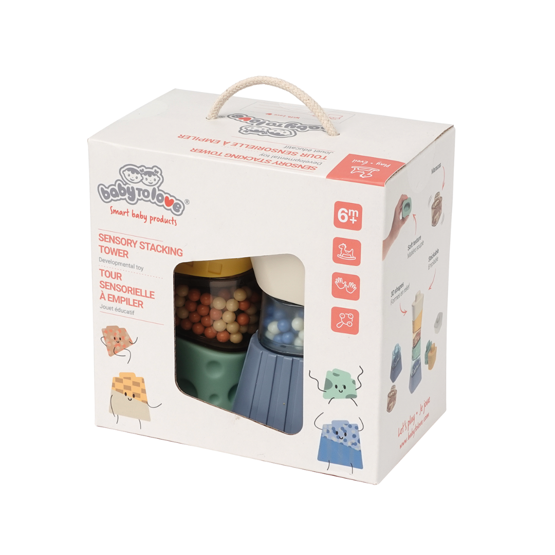 Cubo De Actividades Océano, contiene diferentes texturas y colores en cada tamaño.